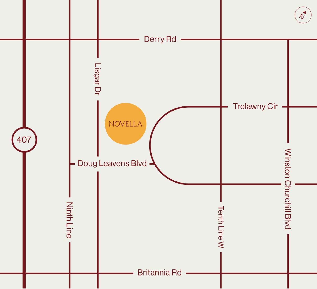 Novella Homes is situated in Meadowvale, Mississauga, Ontario. The location offers a quiet residential atmosphere with excellent connectivity. Major highways such as Highway 401 and Highway 407 are easily accessible, making commuting across Mississauga and the Greater Toronto Area convenient. Meadowvale GO Station is nearby, providing train and bus services for daily travel. Residents enjoy a peaceful setting while remaining close to urban hubs, business districts, and downtown Toronto.